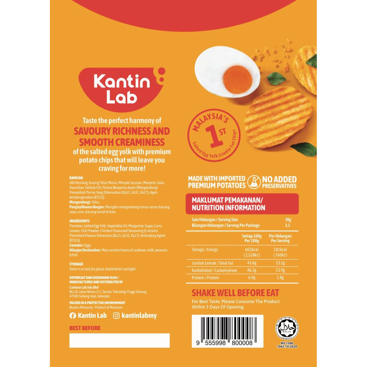 Kantin Lab Salted Egg Crinkle-Cut Potato Chips deliver a refined balance of savory richness and creamy salted egg yolk flavor. Crafted from premium potatoes and enhanced with real curry leaves, these crunchy chips offer a sophisticated snacking experience that satisfies both texture and taste, leaving you eager for more!