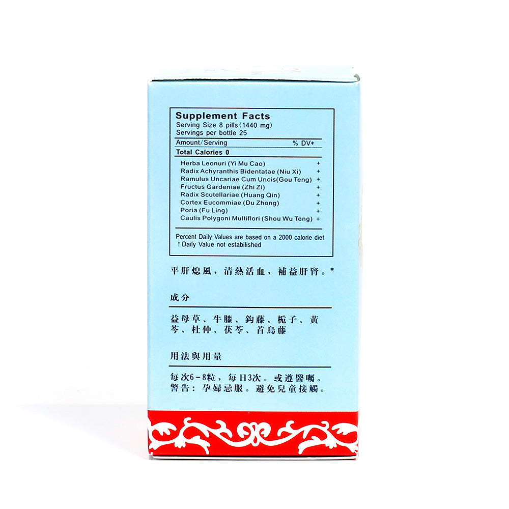 Component: Herba Leonuri (Yi Mu Cao), Radix Achyranthis Bidentatae (Niu Xi), Ramulus Uncariae Cum Uncis( Gou Teng), Fructus Gardeniae (Zhi Zi), Radix Scutellariae(Huang Qin), Cortex Eucommiae(Du Zhong), Poria(Fu Ling ), Caulis Polygoni Multiflori(Shou We Teng)