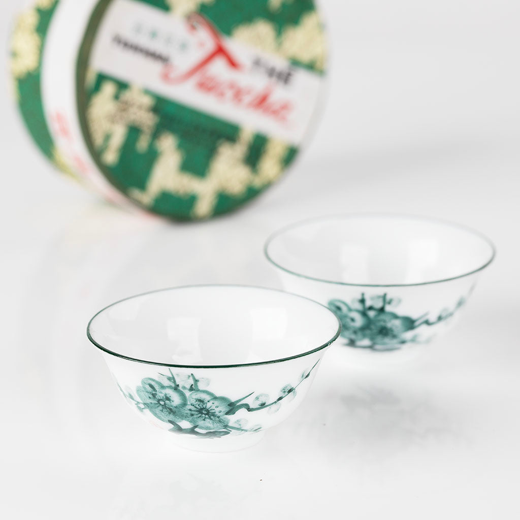 This gift box contains a can of Yunnan Tuocha and a pair of tea cups with elegant plum blossom patterns, all presented in a red gift box from Yonghefeng with protective shredded paper. It combines the unique flavor of Yunnan Tuocha and the delicate tea ware, making it an ideal choice for tea lovers to enjoy or as a thoughtful gift.