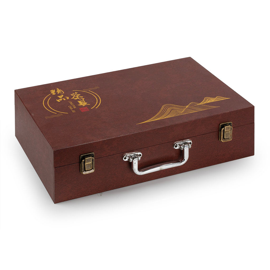 采用仿木纹理皮箱礼盒,红棕配色搭配金色山水与“精品茶具”字样,质感高级且沉稳大气;礼盒内置定制海绵内衬,精准固定每一件茶具,防摔防撞,保障运输安全;搭配金属锁扣与手提把手,拎取便捷,仪式感拉满,是商务礼赠、乔迁新居、茶友互赠的优选。