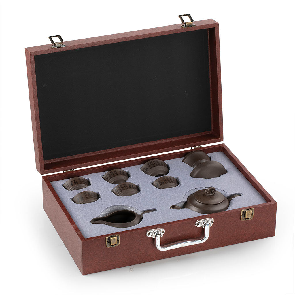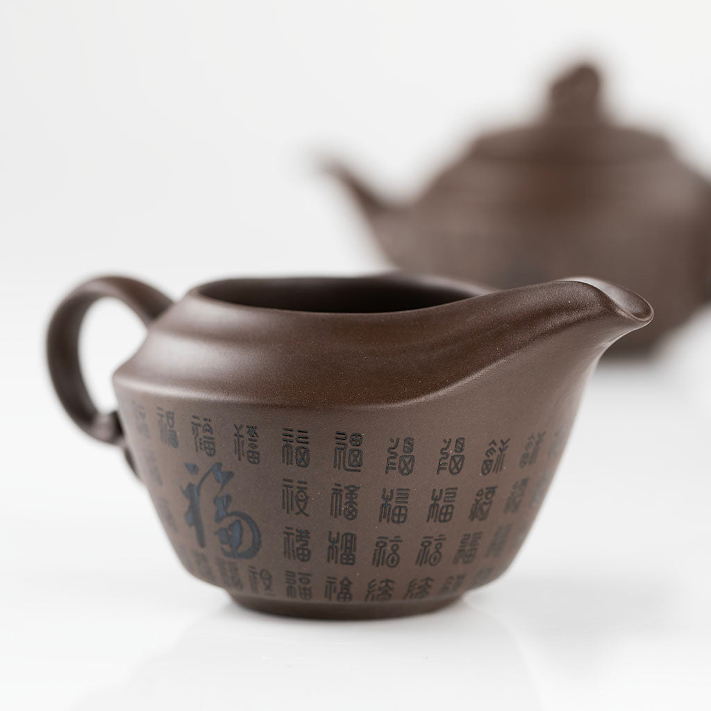壶身、公道杯与品茗杯均雕刻百福纹样,不同字体的“福”字错落排布,核心位置突出大号福字,既传递“百福临门”的美好寓意,又让紫砂茶具更具文化底蕴与艺术美感;壶盖与壶柄采用如意云纹造型,灵动雅致,呼应福文化的吉祥意蕴。