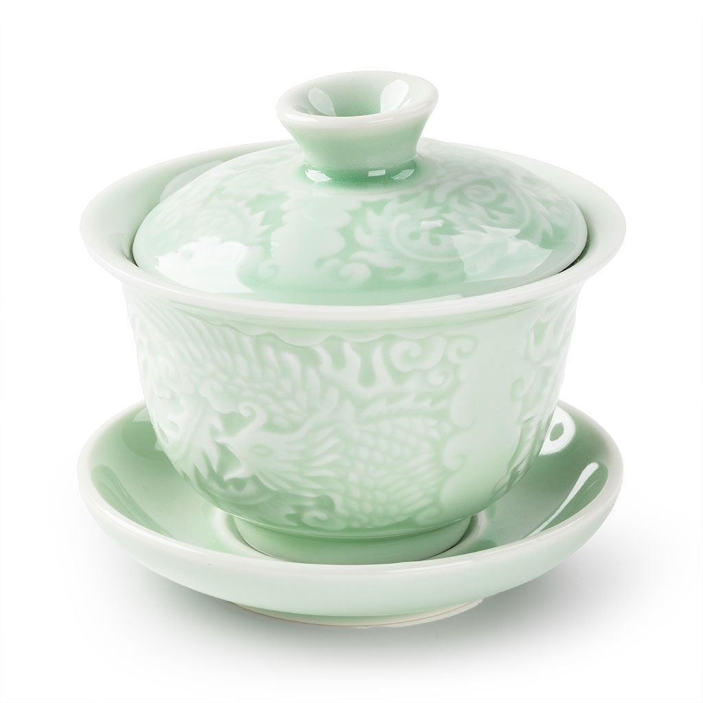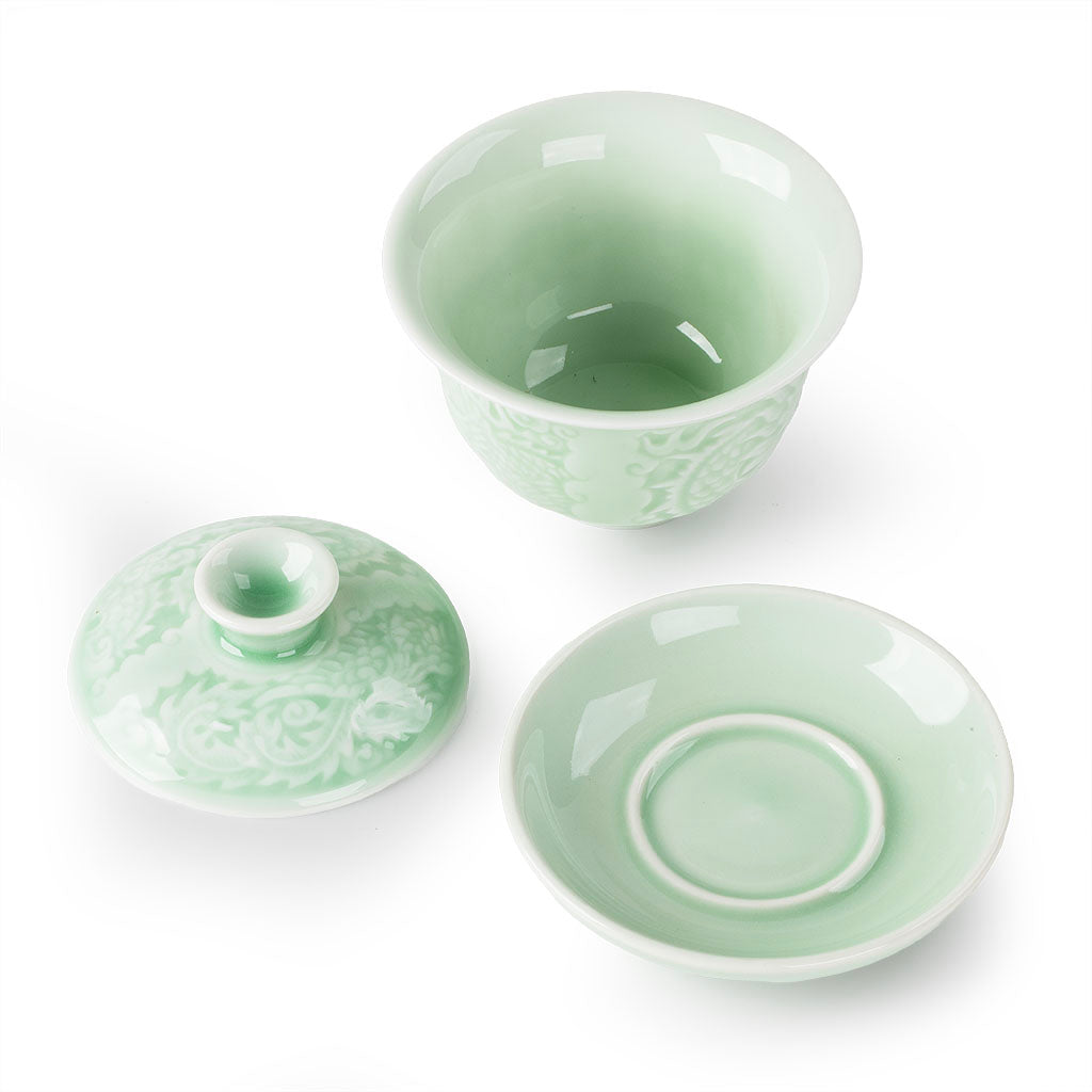 这款青瓷浮雕盖碗是兼具精美与实用的茶具单品,凝聚中国传统陶瓷艺术,为您的茶道体验增色添彩。