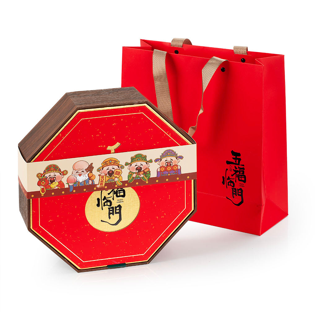 五只品茗杯分呈五色,对应“长寿、富贵、康宁、好德、善终”五福之意,搭配“五福临门”主题八角礼盒,红金配色搭配福禄寿喜财五福图案,年味浓郁;配套手提礼袋,拎取便捷,仪式感拉满。