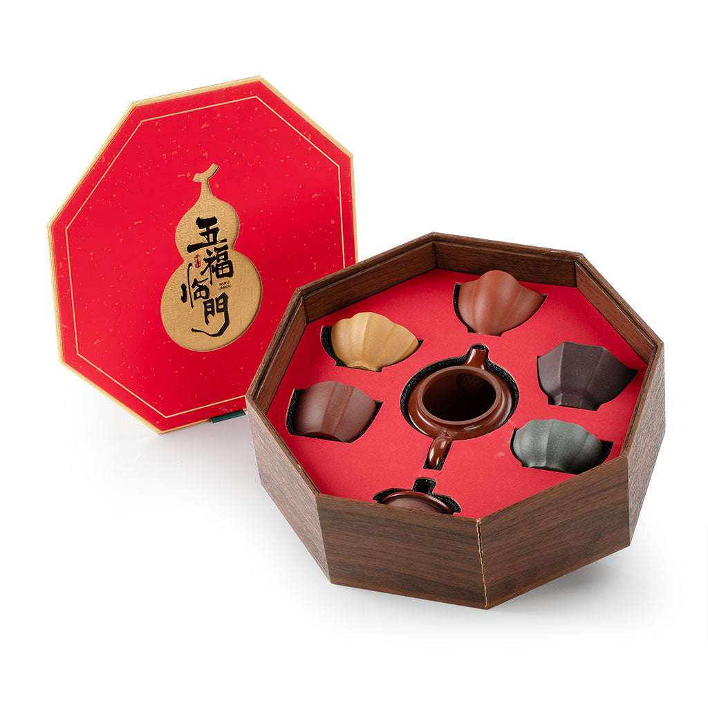 八角仿木纹理礼盒,内衬定制红色绒布,精准固定壶杯,防摔防撞;礼盒与礼袋均印“五福临门”吉祥字样,寓意美好,是春节拜年、乔迁新居、商务馈赠、茶友互赠的优选佳品,尽显心意与格调。