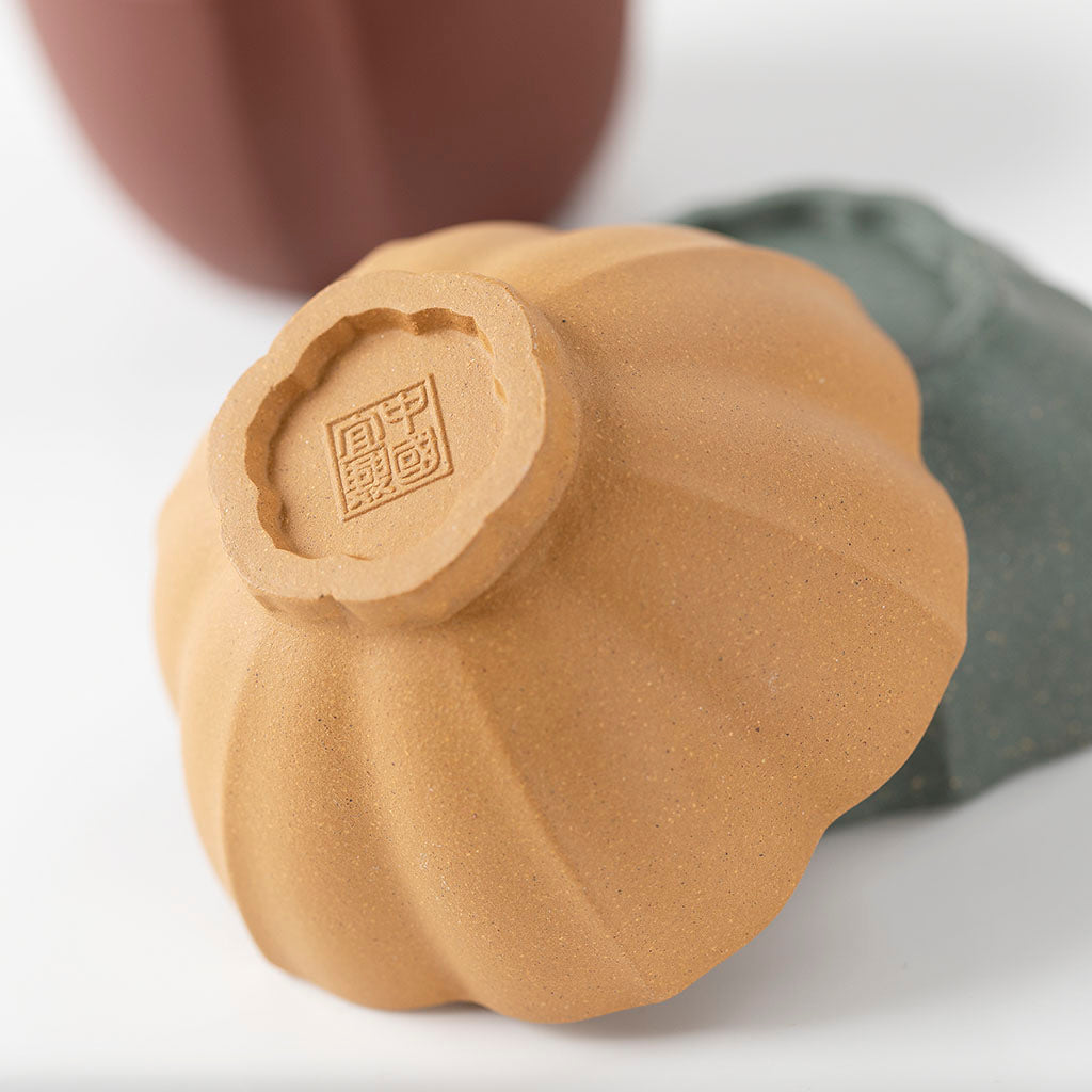 套组包含紫砂德钟壶与五件花口品茗杯,壶型端庄稳重,壶盖与壶口严丝合缝,出水流畅断水利落;品茗杯采用经典花口筋纹设计,杯壁线条舒展,握感温润贴合,杯底篆刻“中国宜兴”印章,彰显正宗工艺底蕴。