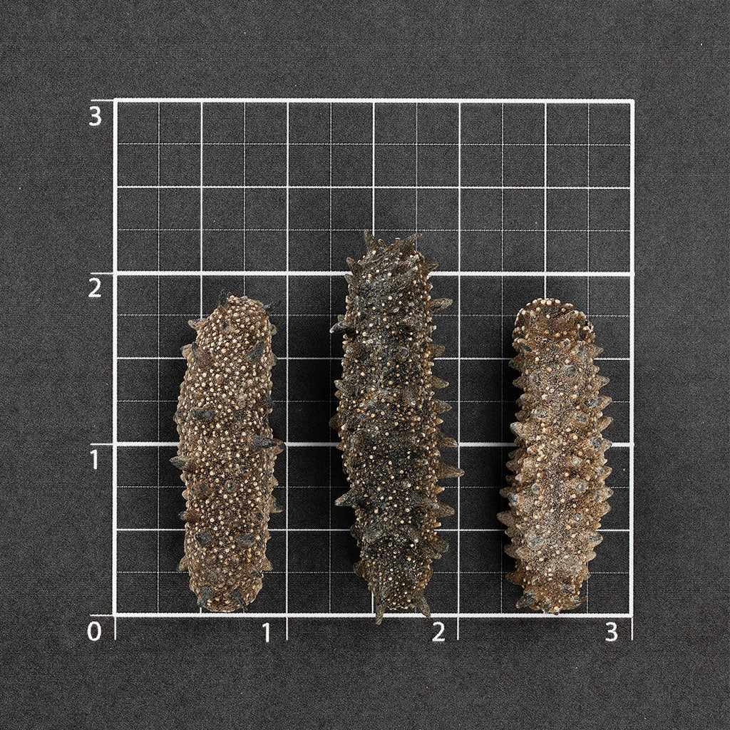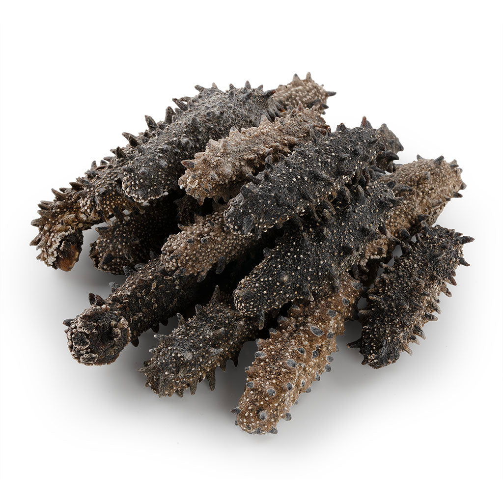 体表坚挺规整的六排肉刺,呈自然深褐至黑褐色,尖刺饱满且纹理清晰,是野生北海道刺参的标志性特征,唯有生长于深海高压环境的优质个体,方能长出如此坚挺密集的肉刺。干参形态饱满厚实,表皮布满细密的珍珠状突起,泡发后体型舒展,肉质肥厚软糯,胶质浓郁黏滑,入口即能感受到深海食材的鲜活质感。