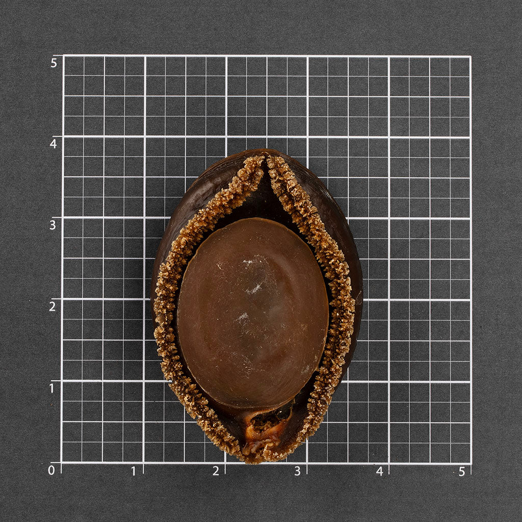 干鲍呈深栗褐色,表面带自然白霜,边缘包裹紧实的颗粒状裙边。泡发炖煮后,肉质软嫩弹韧,核心呈现细腻溏心质感,入口温润回甘,适配煲汤、煮粥、小炒等多种家常做法。