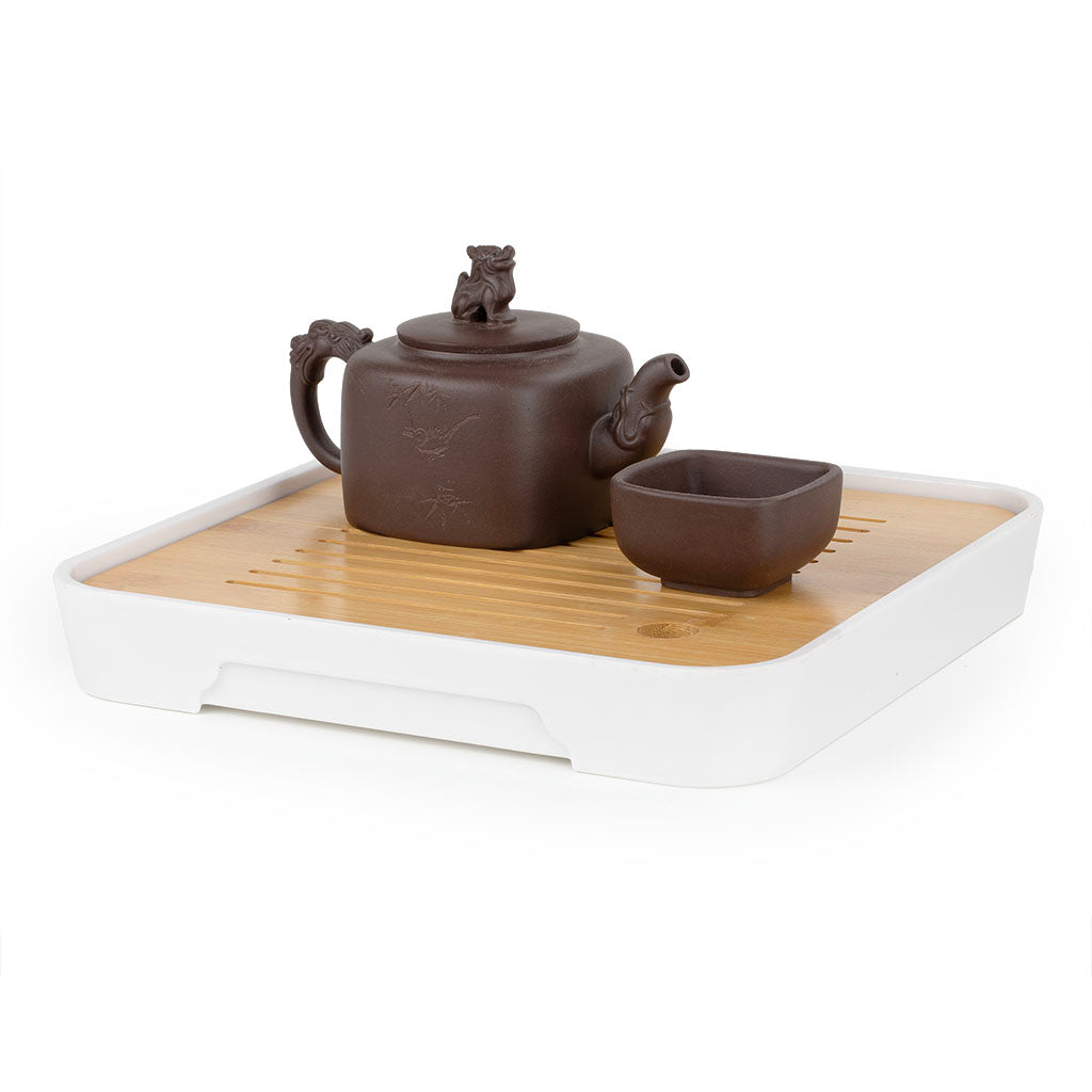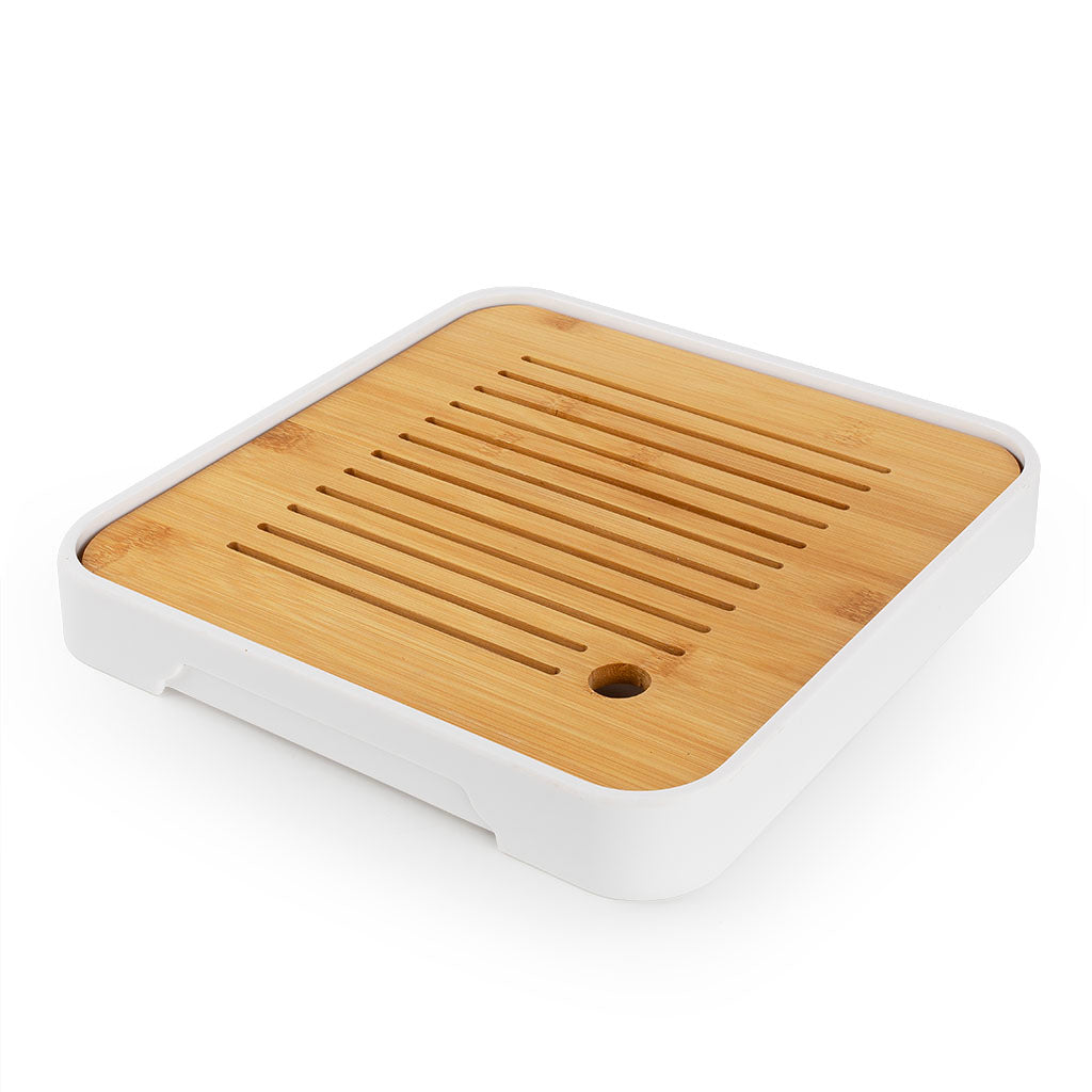底层采用密胺材质,白色外观简洁干净,材质坚固耐摔,不易变形开裂,防水防潮,可有效承接沥下的茶水,避免桌面被浸湿;密胺与竹面衔接紧密,做工精细,无毛刺无松动,25*25cm尺寸小巧,适配单人茶席、桌面摆放等场景。