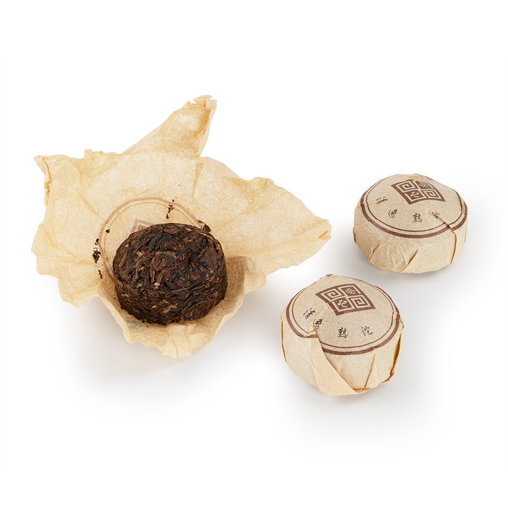 迷你小沱,光滑圆润,厚度适中,条索壮实,肥厚,玫瑰花瓣点缀其间。泡出的茶汤色彩艳丽,口感柔和,玫瑰的清新甜蜜与古树茶的甘醇浑厚是茶汤更有韵味和厚度。