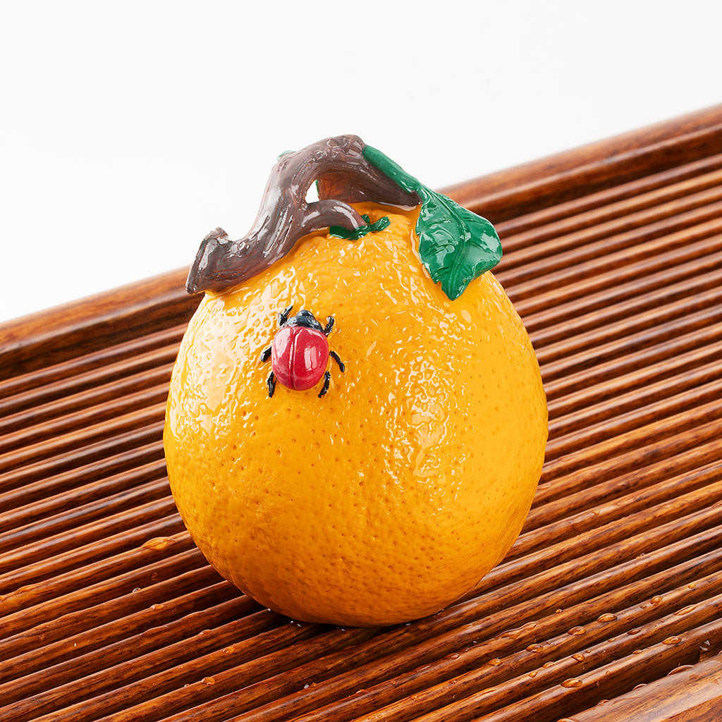 1:1還原真實柑橙的形態細節:圓潤飽滿的果形貼合原生比例,果皮佈滿細密凸起顆粒,觸感逼真;頂部枝葉脈絡清晰,色澤自然,還原柑橙的鮮活姿態;果皮上的瓢蟲造型精巧,肢體細節刻畫到位,無論是靜置茶盤還是遇熱變色,都如真實柑橙般生動討喜,兼具觀賞性與趣味性。