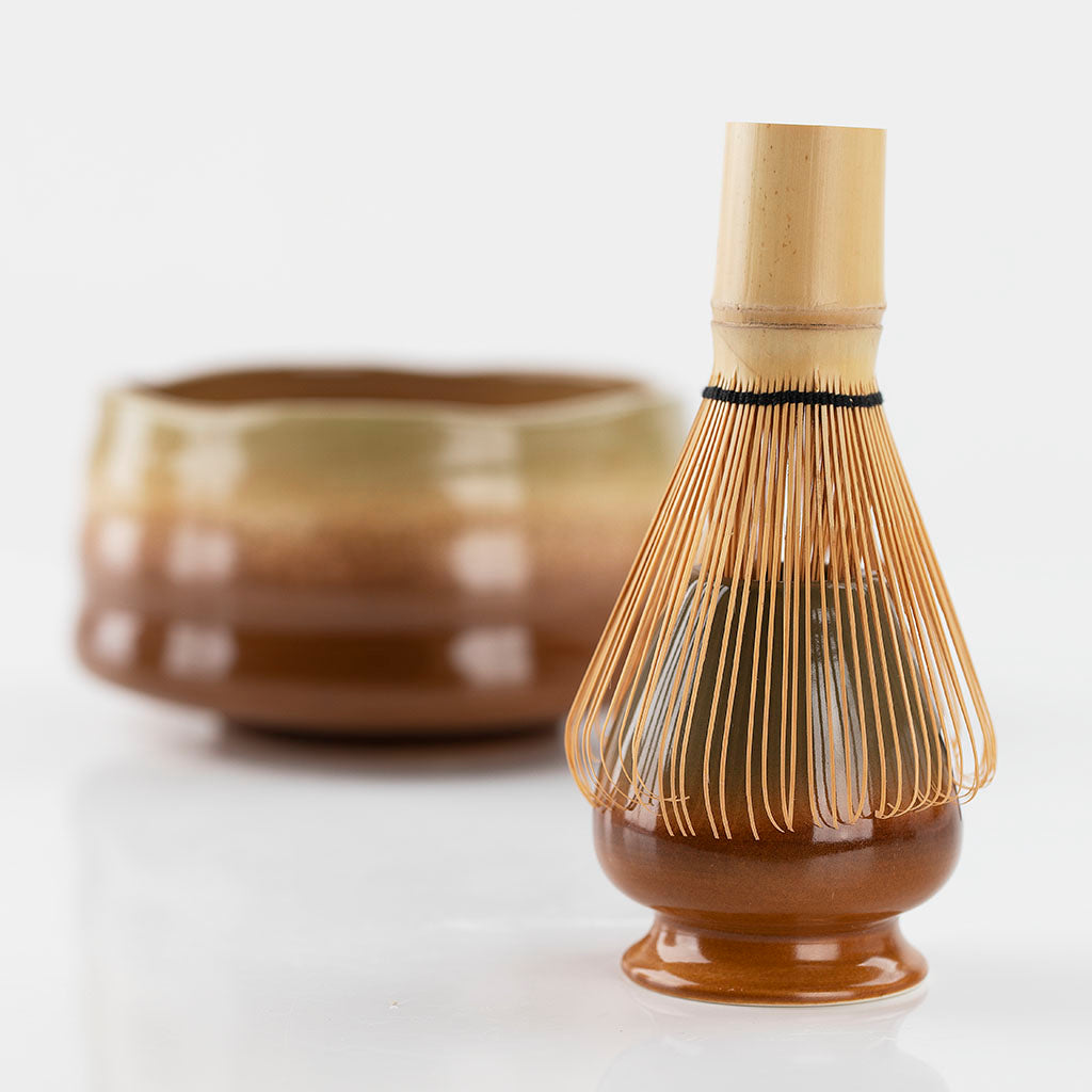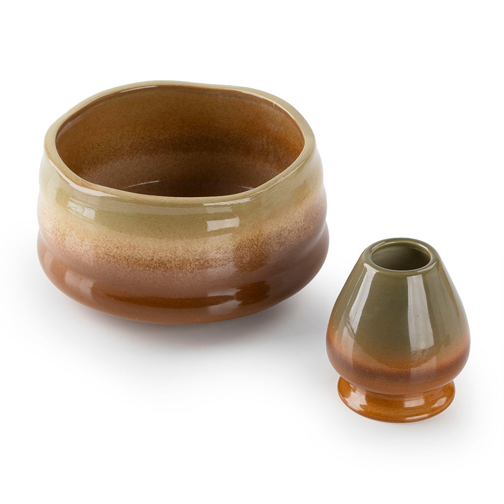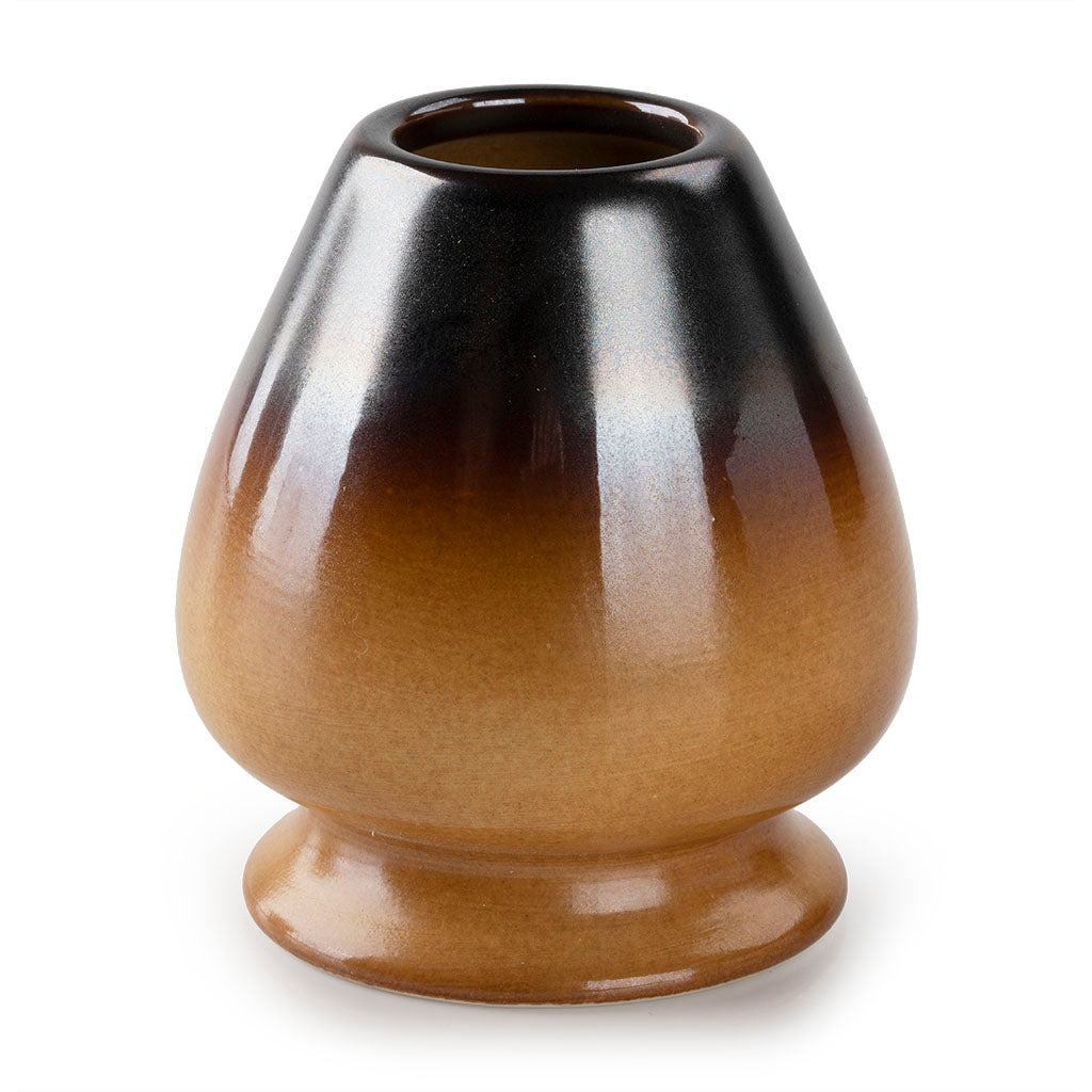 套組包含兩款核心器具:寬口淺腹的波浪邊抹茶碗,碗型貼合點茶手勢,波浪口設計既提升握持舒適度,又能避免點茶時茶湯濺出;配套的茶筅容器採用同款漸變釉,造型圓潤穩固,可收納茶筅並保持乾燥通風,防止茶筅受潮變形,完整覆蓋點茶、收納全流程。