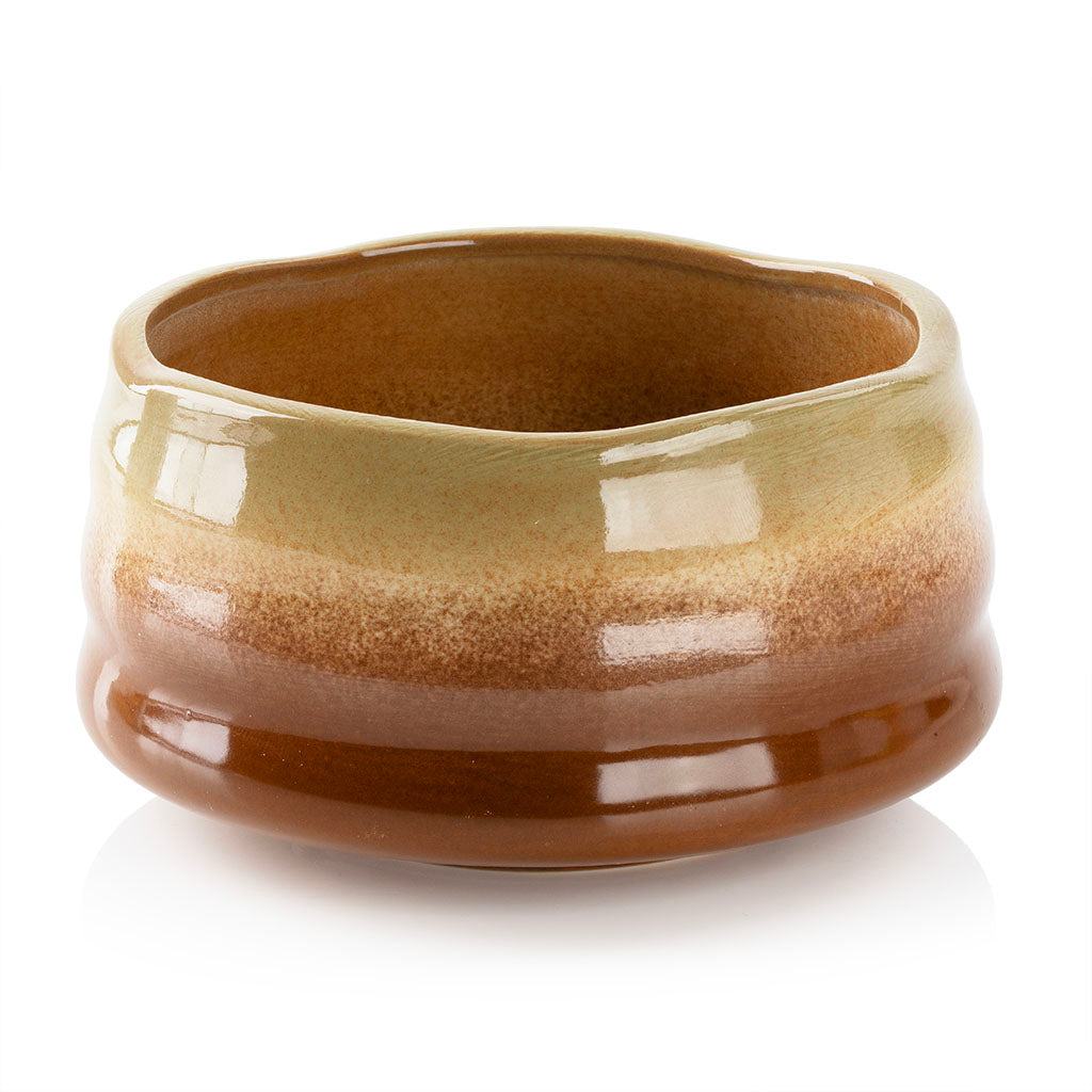 採用手工窯變漸變釉工藝,以深邃黑棕與暖調棕黃交融出層次釉色,釉面溫潤亮澤,自帶自然窯變的細膩紋理;碗口設計為波浪形輪廓,打破規整器型的單調,還原日式侘寂風的質朴隨性,置於茶席盡顯東方禪意與自然質感。
