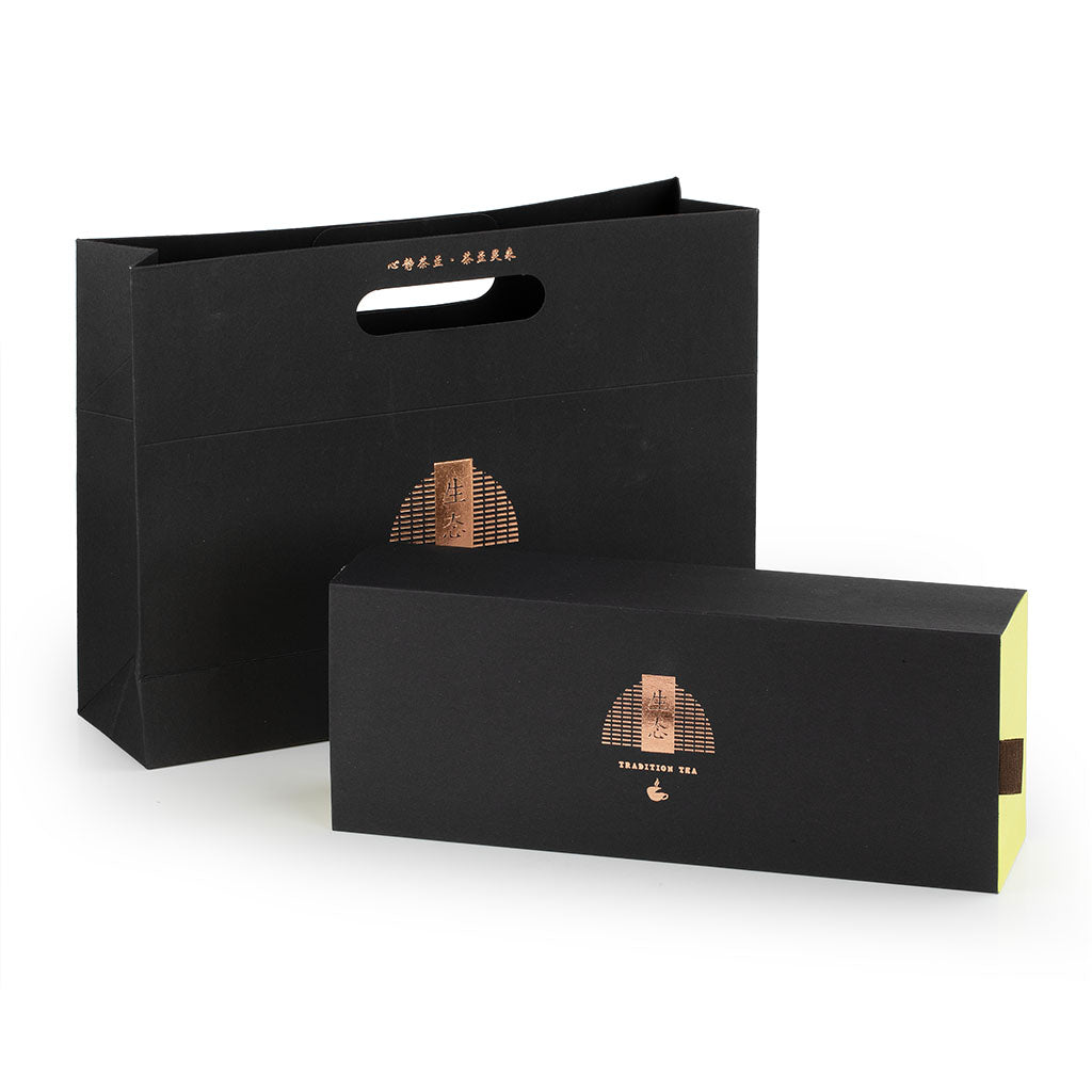 3. 黑金高端禮盒:外盒純黑質感搭配內盒黃綠撞色設計,配同色系手提袋,內嵌獨立小泡袋,兼具東方美學與鎖鮮實用性,是商務禮贈與私享品鑑的上佳之選。